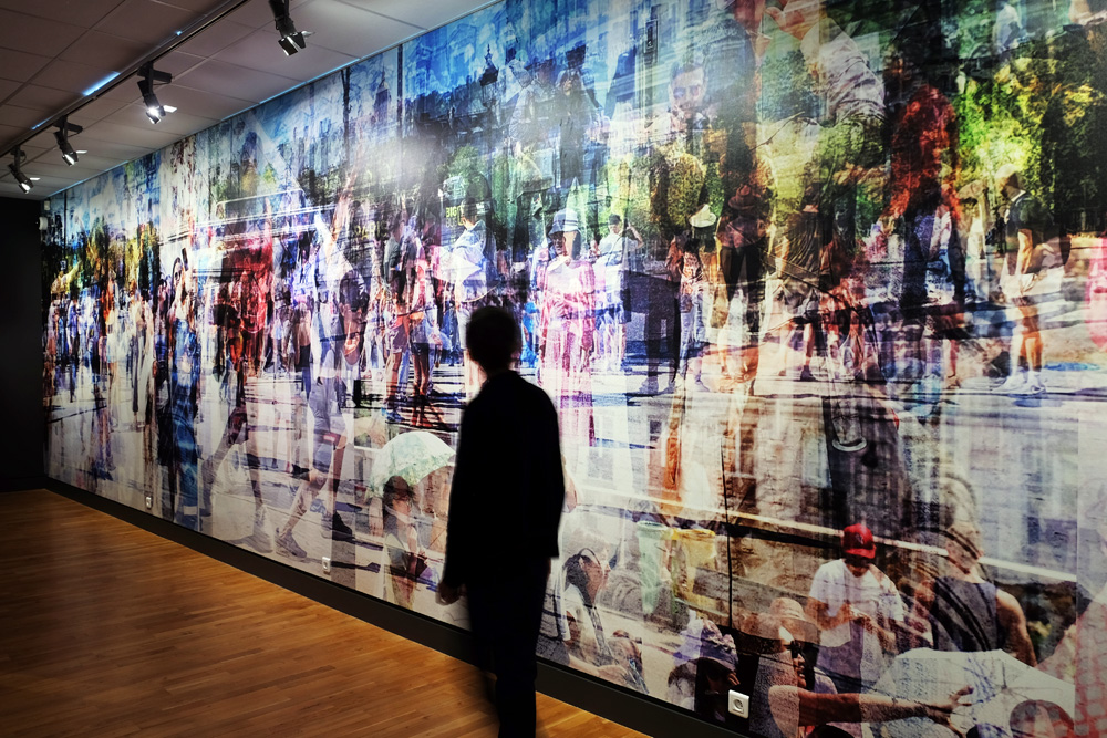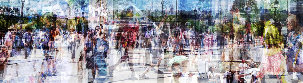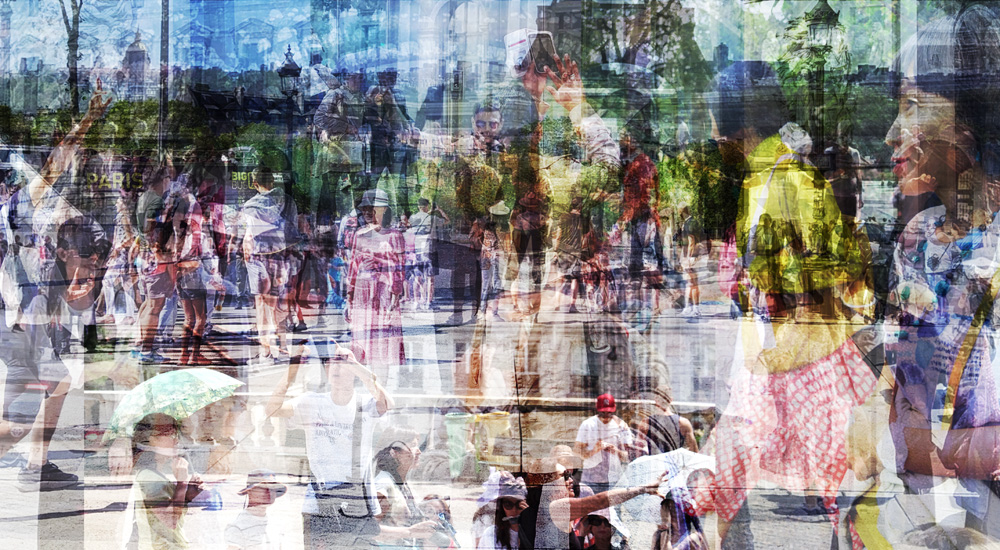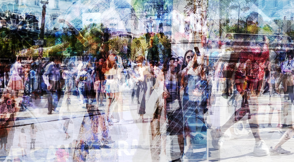 Huit ans après ME. Here Now, l’artiste est revenue à Paris photographier des personnes en train de prendre des photos et s’est notamment promenée aux abords de la pyramide du Louvre. Elle a ensuite traité ses images en transparence et en superposition, à la façon des vues de monuments, mais sans les accrocher à un axe en particulier, puis les a empilées de façon désordonnée pour intensifier un chaos.